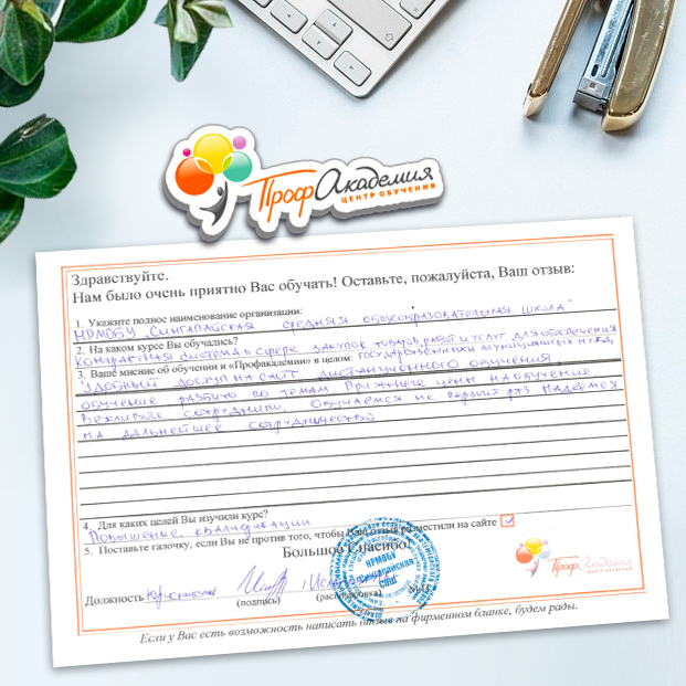Спасибо большое за организацию курса повышения квалификации "Контрактная система в сфере закупок товаров и услуг", "Основы коррупционного законодательства и противодействия коррупции". Хочется отметить содержательность программ, и их практическое значение. Особая благодарность руководителю центра образовательных услуг Ларисе Михайловне Оленниковой. Процветания и удачи академии!